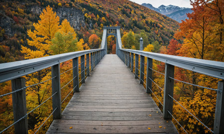 A narrow bridge spans a peaceful river, embraced by colorful autumn trees reflecting in the calm water. This picturesque location invites tranquility and natural beauty.