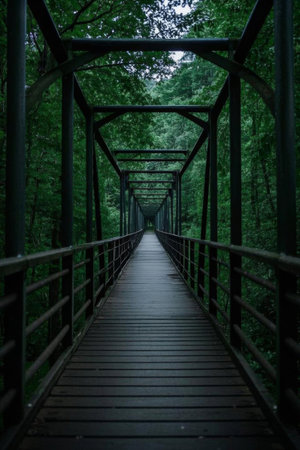 A wooden bridge in a quiet forest, a green plank road to a secret place