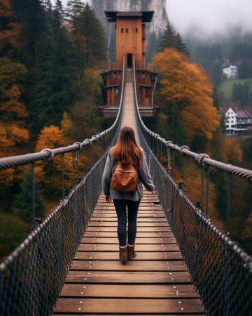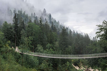 suspension bridge and foggy autumn forest in austria