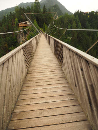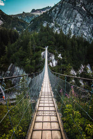 Suspension Bridge in Switzerland. Pedestrian hanging bridge over river in Alps