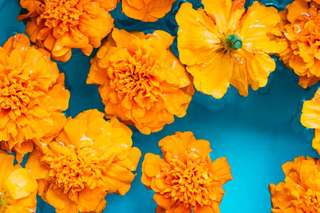 Orange flowers on blue water background. Flat lay. Top view