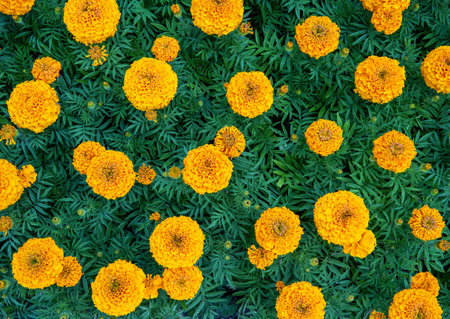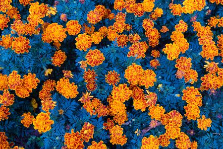 View from above on colorful marigold flowers blooming in the garden.