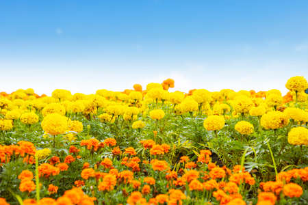 Beautiful Marigold flowers blooming in the garden with blue sky background