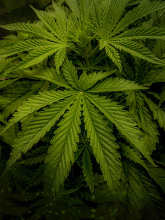 Growing cannabis indica, marijuana leaves, marijuana vegetation plants, hemp CBD, cultivation cannabis, background green, light leaks color tones top view