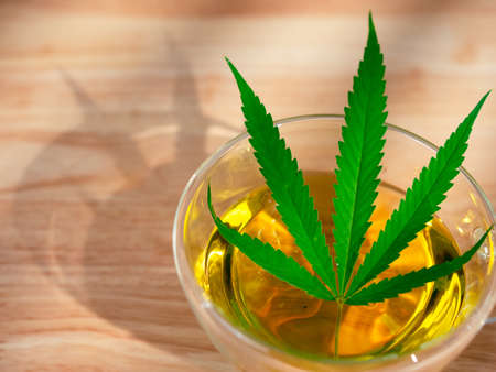cannabis sativa hemp leaf hot tea herbal CBD healthy drink for relaxation