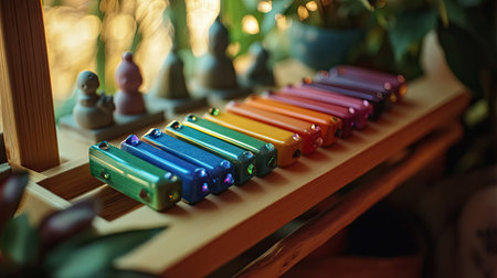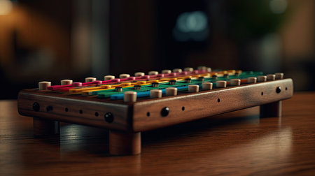 A close-up of a child's colorful xylophone, with space for text on the surrounding wooden surface.