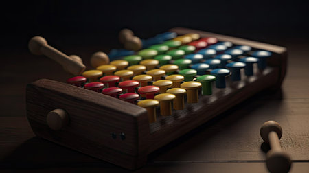 Close-up with a selective focus of a wooden xylophone with coloured tones and sharp tones. On it are the two wooden stick meant for playing it.