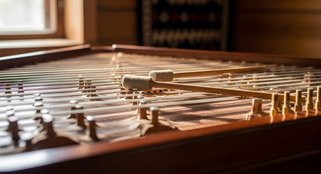 A close-up shot of a hammered dulcimer with two small mallets resting on its numerous strings. The warm, soft lighting in a rustic wooden room highlights the traditional folk instrument, evoking a sense of calm and beautiful acoustic music.