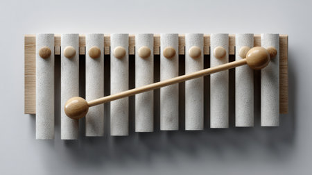 A captivating image showcasing a wooden xylophone illuminated by natural light, casting intricate shadows on a rustic tabletop, ideal for music-related themes.