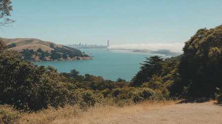 A serene landscape showcasing San Francisco Bay with the iconic Golden Gate Bridge in the distance, surrounded by lush greenery and soft fog.