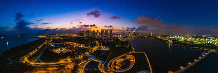 Panoramic aerial view of Singapore skyline from a drone point of view at dusk.