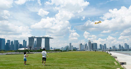 Singapore, Oct 2019: People flying kites on grass at Marina Barrage recreational park. Singapore city skyline with Marina Bay Sands hotel, city downtown with modern skyscrapers