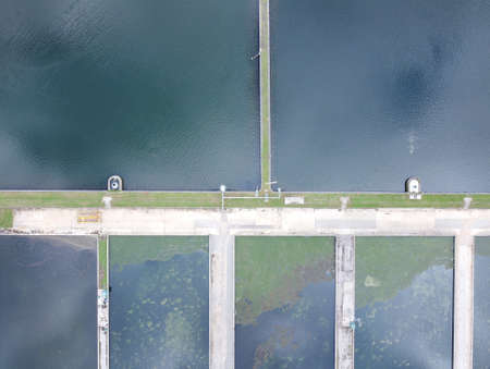 looking down at a body of water in a water treatment plant
