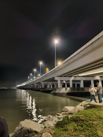 A long, modern highway bridge stretches across dark waters, brightly illuminated by numerous streetlights that cast reflections on the calm surface. The powerful concrete structure stands out against the dark night sky. In the foreground, two figures can be seen on the grassy, rocky bank, engaged in night fishing, adding a human element to the impressive display of civil engineering and nocturnal activity.