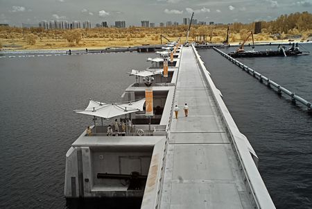 Type of cargo terminal and cranes, berths for transshipment of bulk cargo, iron ore and coal. Port Zhuhai, China.