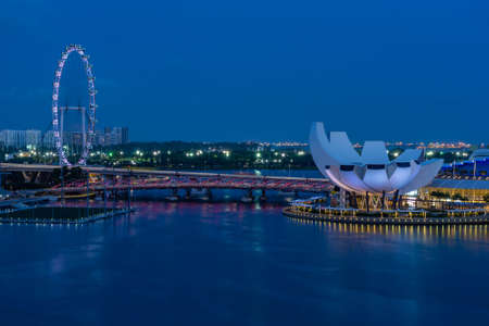 SINGAPORE-MAY 18, 2019 : Cityscape Singapore modern and financial city in Asia. Marina bay landmark of Singapore. Night landscape of business building and hotel. Panorama view of Marina bay at dusk.