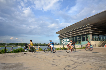 SINGAPORE- MAY 31: People jog and cycle on the bridge of Marina Barrage, Singapore on May 31, 2015. Marina Barrage is a government-commissioned dam built across the mouth of Marina Channel