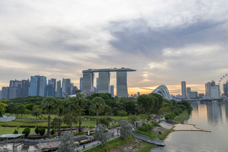 Singapore-29 Jun 2024: Vibrant Singapore skyline with Marina Bay Sands, Gardens by the bay at sunset. Taken from Marina Barrage