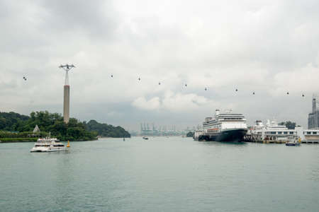HARBOURFRONT, SINGAPORE - JANUARY 3, 2017: Wide view of ferries and cruise ships docked along the Sentosa bay on a cloudy day, with cable cars in the background. Travel and tourism.