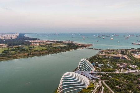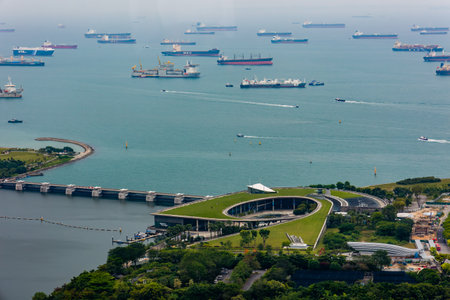 SINGAPORE - APRIL 06 2023: Ships waiting in the Strait outside the Marina Barrage in the waterfront area of the city of Singapore