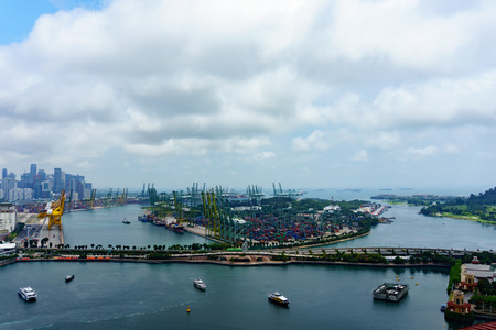 panorama landscape view of commercial port of singapore with cloudy sky. very busy port and important for logistic and transportation in asia. transportation concept.
