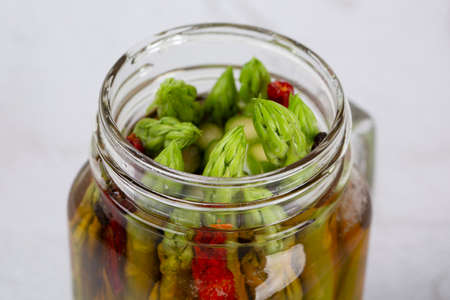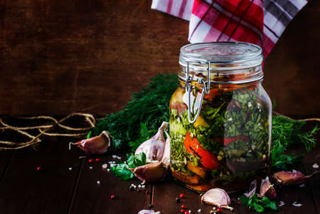 Baked pickled sweet pepper with garlic and thyme in a glass jar. Selective focus.