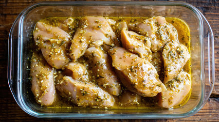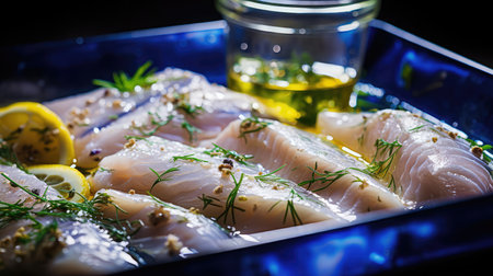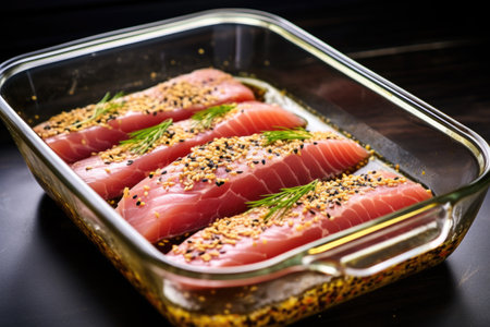 freshly marinated fish sitting in a light-colored bowl, created with generative ai