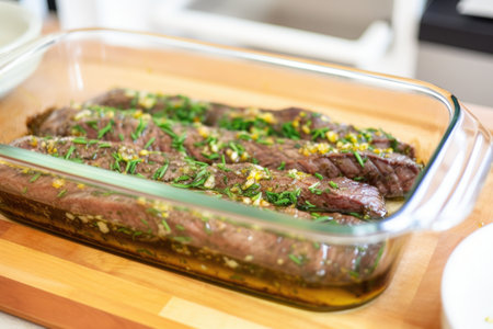 A juicy flank steak marinating in a bowl with herbs, olive oil, and garlic, ready for grilling.