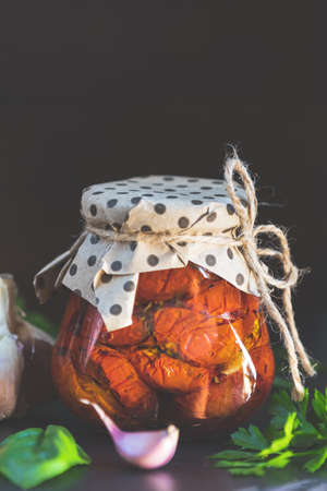 Sun-dried pickled tomatoes in oil and herbs. Classic italian appetizer for wine in italian cuisine. Vegetarian snack.