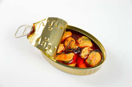 Tin can of sprats, sardines set, on white stone table background, top view flat lay, with copy space for text
