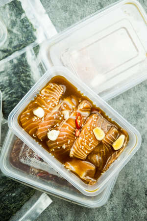 Shrimps marinated with Korean soy sauce with garlic and red chili in transparent plastic box for food delivery