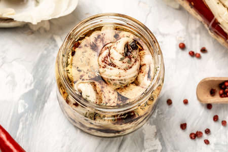 Fermented canned champignon mushrooms in a glass jar with garlic and bay leaf