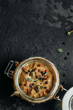 Slices of herring with spices in a glass jar. Mustard seeds, bay leaf, pepper mix. Healthy traditional food concept. Stone background, close up, macro