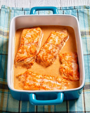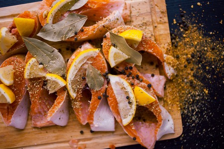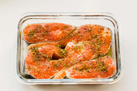 Marinated slices of salmon fillet. Cooking healthy food. Sea foods