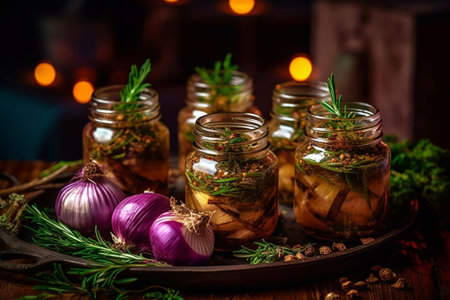 Cooking homemade pickled red onions in jars, bright background, copy space