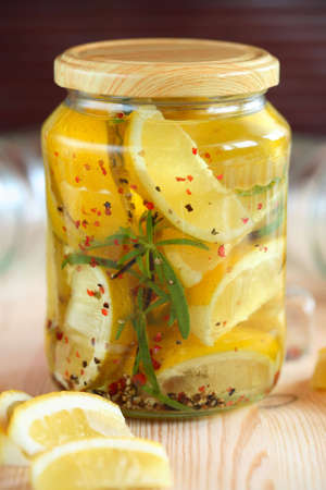 A jar of preserved lemons, with slices of lemon and sprigs of rosemary visible, placed on a kitchen counter.