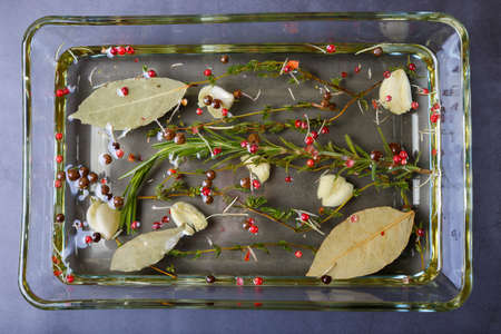 Selection of scented oils from herbs and spices: rosemary, garlic, pepper, parsley, bay leaf. On a dark gray stone kitchen table. Top view, copy space