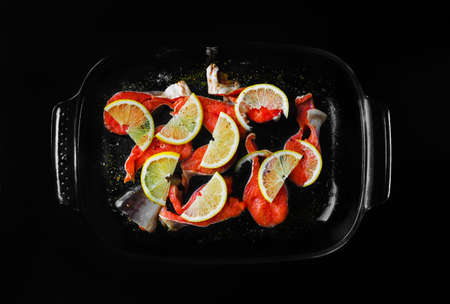 Raw redfish carcasses without heads, also known as ocean perch, prepared with spices for baking in glass baking dish on a dark surface
