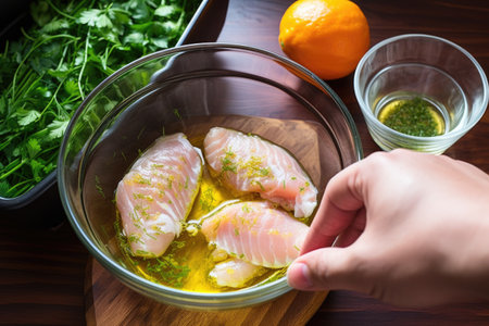 hand stirring fish fillet in a bowl filled with citrus marinade, created with generative ai