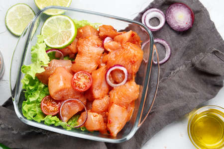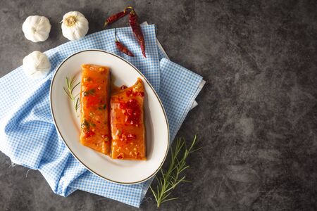 Marinated slices of salmon fillet. Cooking healthy food. Sea foods