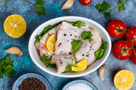 Raw fresh chicken thighs with spices and vegetables in a glass bowl. Many food ingredients on light blue wooden background. Top view, shallow depth of the field, toned and processing photo.