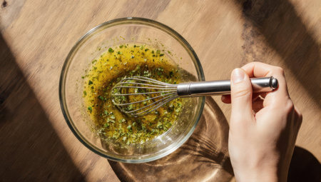 A close-up shot of a hand whisking a green and yellow dressing in a clear glass bowl, placed on a wooden surface, with sunlight.