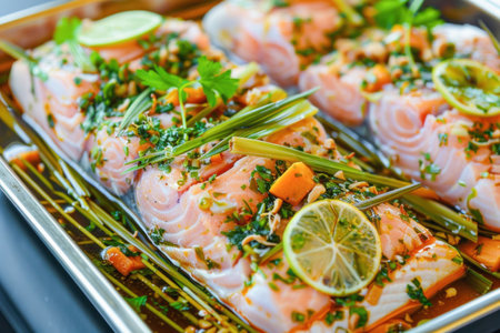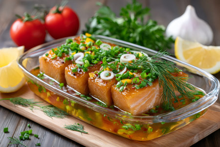 freshly marinated fish sitting in a light-colored bowl, created with generative ai