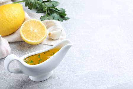 Ceramic boat with lemon sauce on light table, space for text. Delicious salad dressing