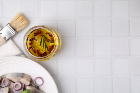 Tasty fish marinade in jar and herring on light tiled table, flat lay. Space for text