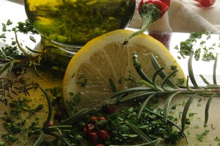 Different sorts of cooking oil,olive oil flavored and Sesame oil with spices herb rosemary ,thyme,dill,sage and parsley set up with old wooden background.