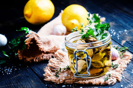 Marinated mushroom. Canned forest mushrooms in jar. Preserved vegetarian organic fungus in marinate. Deliciuous gourmet appetizer. Fall harvest preserve cuisine with spice