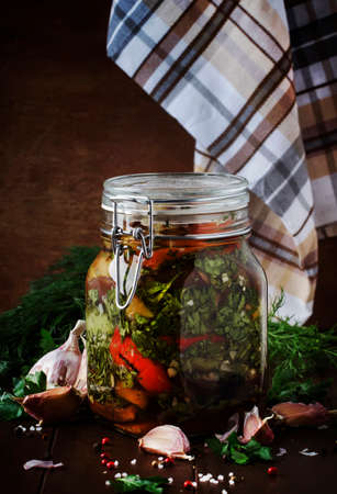 Homemade Canned Grilled Eggplant and Bell Pepper with garlic, parsley, vinegar and oil in glass jar, rustic still life, selective focus