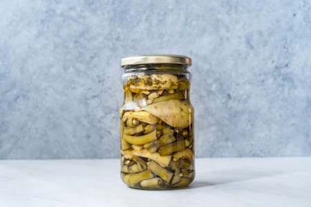 Canned slices of fried artichokes in a glass jar on a light background. selective focus.