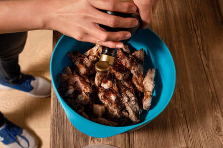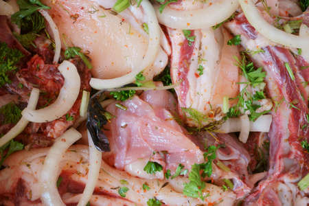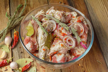 Pork ribs, sliced and marinated with onions. Shish Kebab meat in a glass bowl and spices on a wooden rustic table.Selective focus, close-up, top view.
